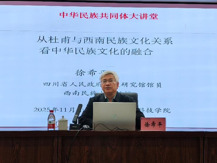 11月3日下午,学校在卓立楼卓越厅举办了题为《从杜甫与西南民族文化关系看中华文化的融合》的铸牢中华民族共同体意识专题讲座。本次讲座邀请西南民族大学二级教授,博士生导师,国家社科基金重大项目首席专家,四川省社科重点基地杜甫研究中心首席专家、四川省杜甫学会会长徐希平主讲。学校党委书记彭体春,党委统战部部长王小娟,各二级学院教师和学生共计260余人现场聆听。讲座由党委副书记舒卫华主持。