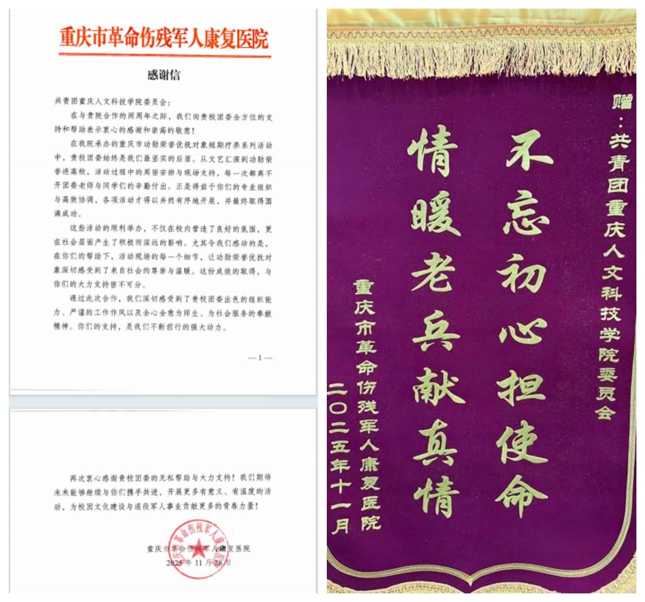 近日,学校收到重庆市荣军院寄来的“感谢信”和“锦旗”,感谢信称“在与贵院合作的两周年之际,向贵校团委全方位的支持和帮助表示衷心的感谢和崇高的敬意!”携手合作的两年间,学校团委积极响应国家关于加强退役军人服务保障工作的号召,深度参与并大力支持重庆市荣军院承办的“重庆市功勋荣誉优抚对象短期疗养系列活动”,在合作期间我校累计参与演出6次,举办功勋模范进校园活动3次,超过1300人次学生参与,凭借卓越的组织协调能力和真诚的志愿服务精神,赢得了合作单位的高度认可与衷心感谢,为学校赢得了崇高荣誉!