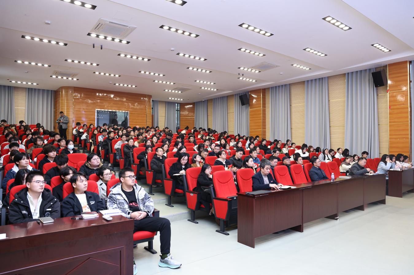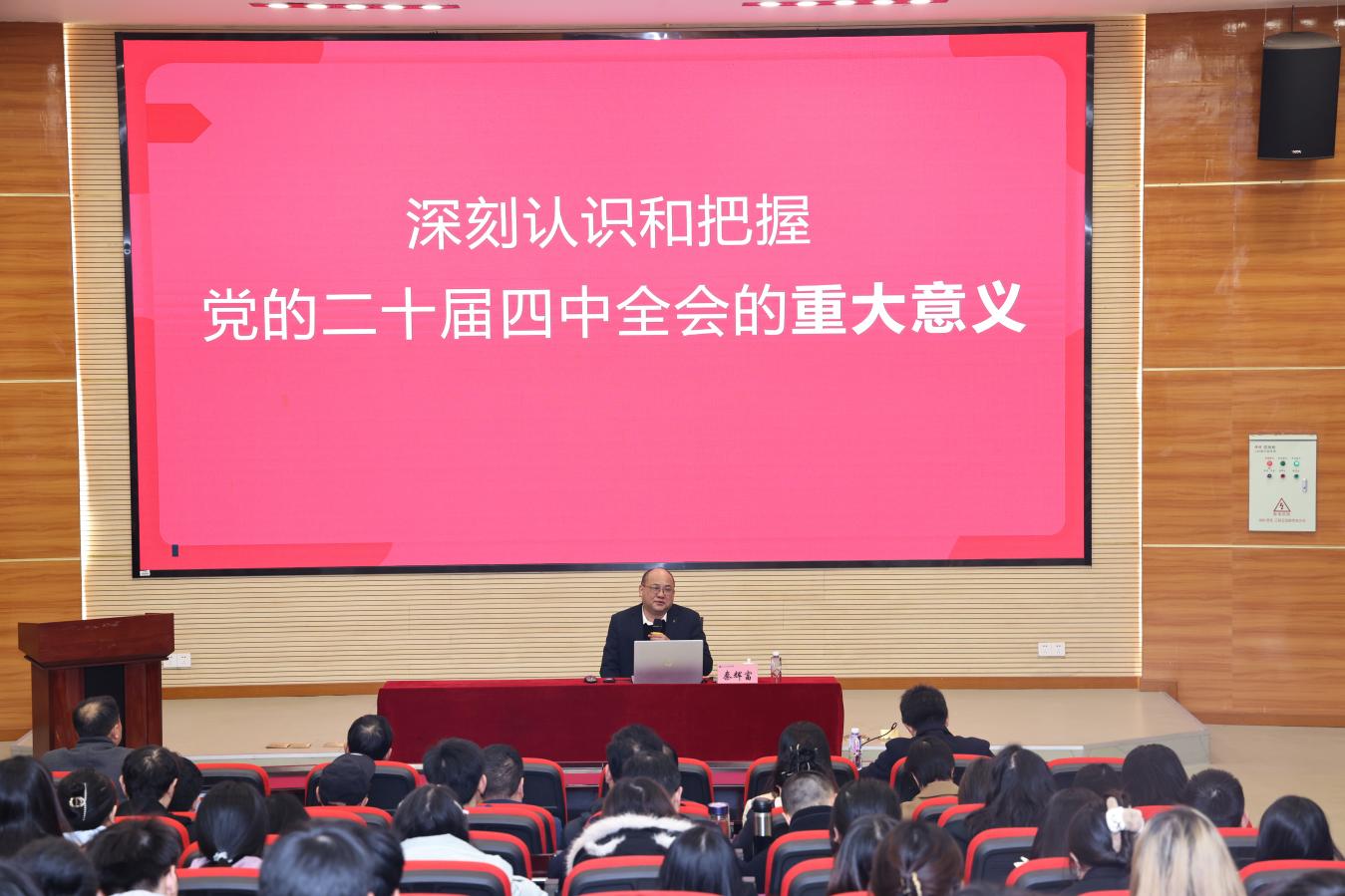 为深入学习宣传贯彻党的二十届四中全会精神,切实推动全会精神在校园落地生根,为学校高质量发展注入强劲动力,12 月 10 日下午,合川区委常委、政法委书记秦辉富走进学校明德楼 16107 报告厅,作题为《深刻认识和把握四中全会精神 —— 将青春融入热土,做优秀的现代大学生》的专题宣讲报告。学校党员校领导、党委委员、机关职能部门负责人、二级党组织负责人及师生代表共计 200 余人现场聆听,报告会由学校党委书记、政府督导专员彭体春主持。