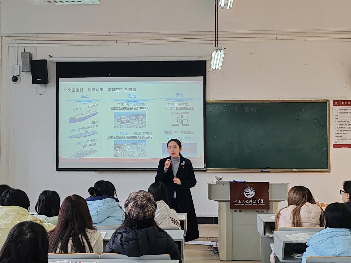 吴静校长助理旁征博引、以案说理,从“经济增长”“科技创新”“民生福祉”“内需市场”“产业升级”五个维度,将宏观的发展数据转化为可感可知的现实案例,与同学们展开热烈互动,让课堂氛围持续升温。在互动中,她邀请同学分享家乡近年来的发展变化,从县域经济崛起等微观视角,印证我国作为全球发展“最稳定、最可靠、最积极”动力源的硬核实力。谈及创新发展,她以“大国重器”的突破为例,将“LNG运输船”与“华龙一号”核电站的故事娓娓道来:“大家知道吗?被称为‘海上超级冷冻车’的LNG运输船,曾是少数国家垄断的高端装备,而‘十四五’期间我国不仅实现自主建造,还拿下全球超30%的订单,能把-163℃的液化天然气安全运到世界各地”。她结合“双减”政策落地、老旧小区改造、县域医共体建设等身边事,与同学们交流民生改善带来的获得感,让大家真切体会到“幼有所育、学有所教、劳有所得”的民生温度。她还结合文化产业发展趋势,鼓励汉语言文学专业同学挖掘本土文化资源,在产业升级浪潮中找准专业定位。