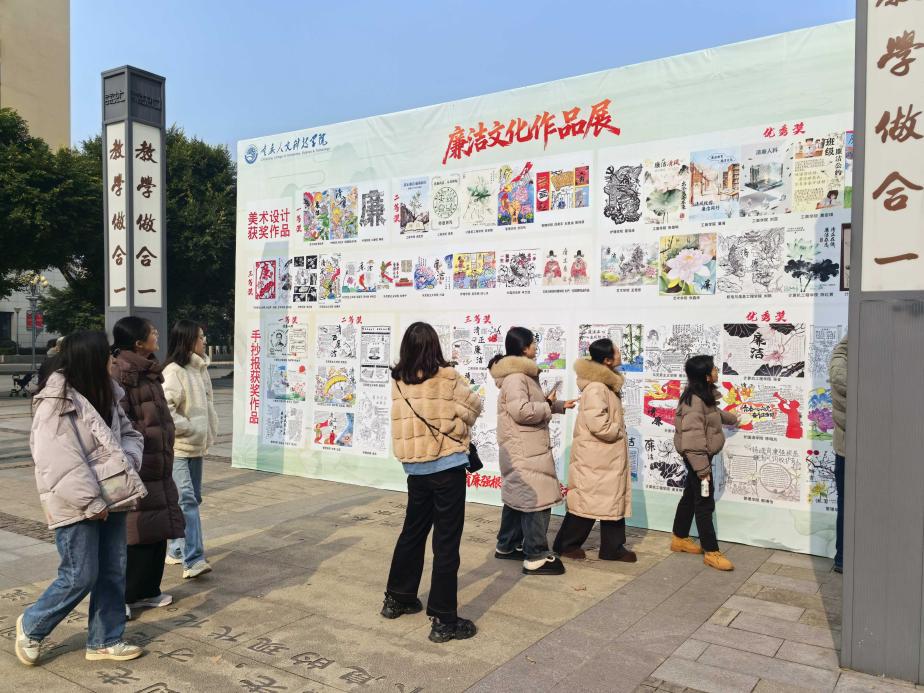 活动现场分为两大主题展区。廉洁作品展区集中陈列了在本次宣传教育月中评选出的118件获奖作品,涵盖硬笔书法、软笔书法、手抄报及美术设计四大类别。作品主题鲜明、构思精巧,师生们以笔为媒、以画喻廉,将廉洁理念融入艺术创作,生动传递出清正廉洁的价值追求。一旁的“清廉人科”建设成果展区,则通过17块图文并茂的专题展板,系统展示了各二级学院、校团委及机关党总支在清廉建设方面的创新举措与扎实成效,勾勒出全校上下共建清廉校园的生动画卷。