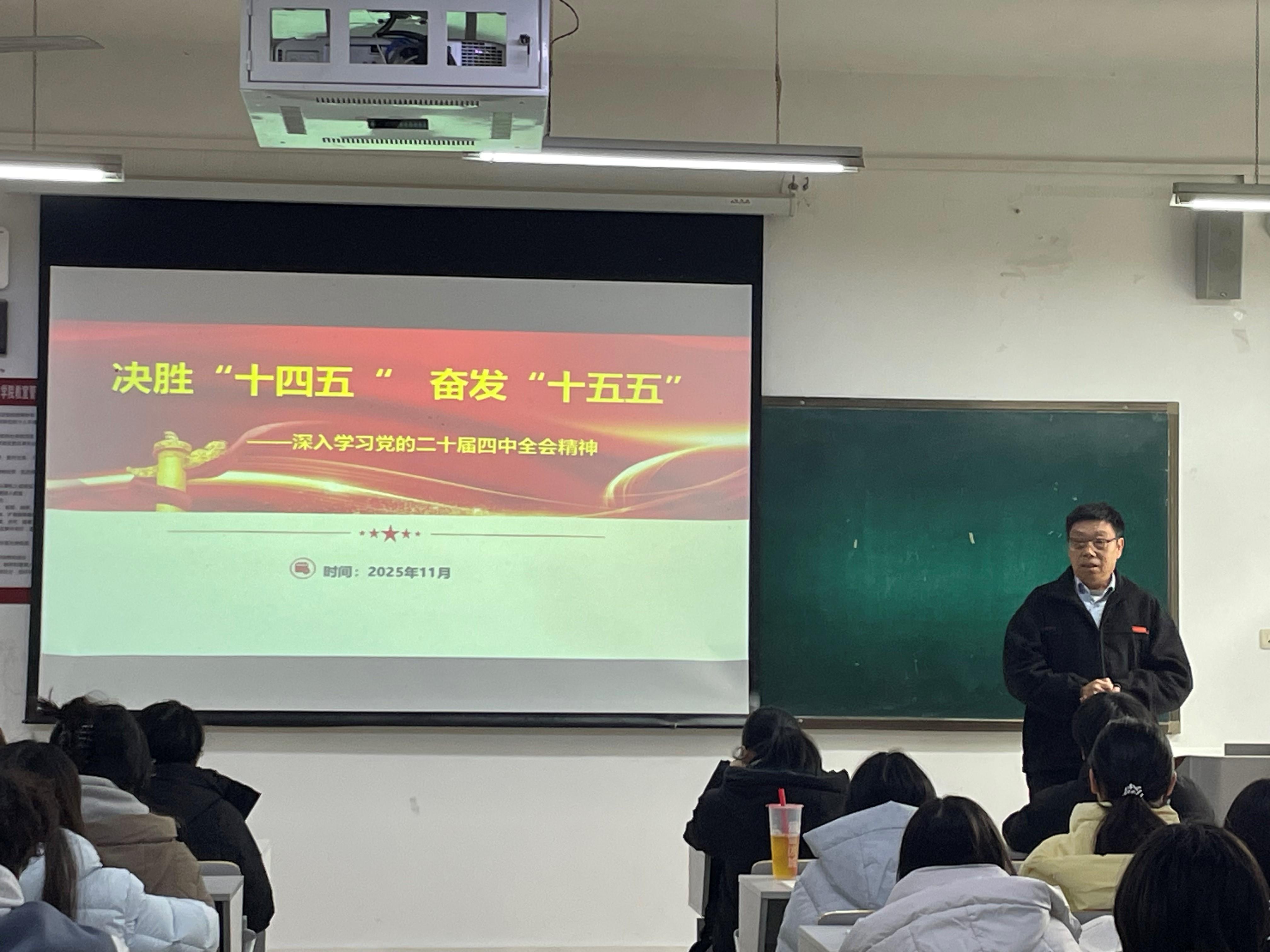 此次授课以“决胜‘十四五’奋发‘十五五’—深入学习党的二十届四中全会精神”为主题,旨在引导学生深刻领会国家发展规划的核心要义,明晰新时代青年的使命担当,凝聚奋发进取的青春力量。授课伊始,孙敏副校长从“党的二十大及历次全会沿革”切入,系统梳理了相关会议的历史脉络与部署,帮助同学们构建起对党的重大决策的宏观认知框架,为后续学习奠定基础。