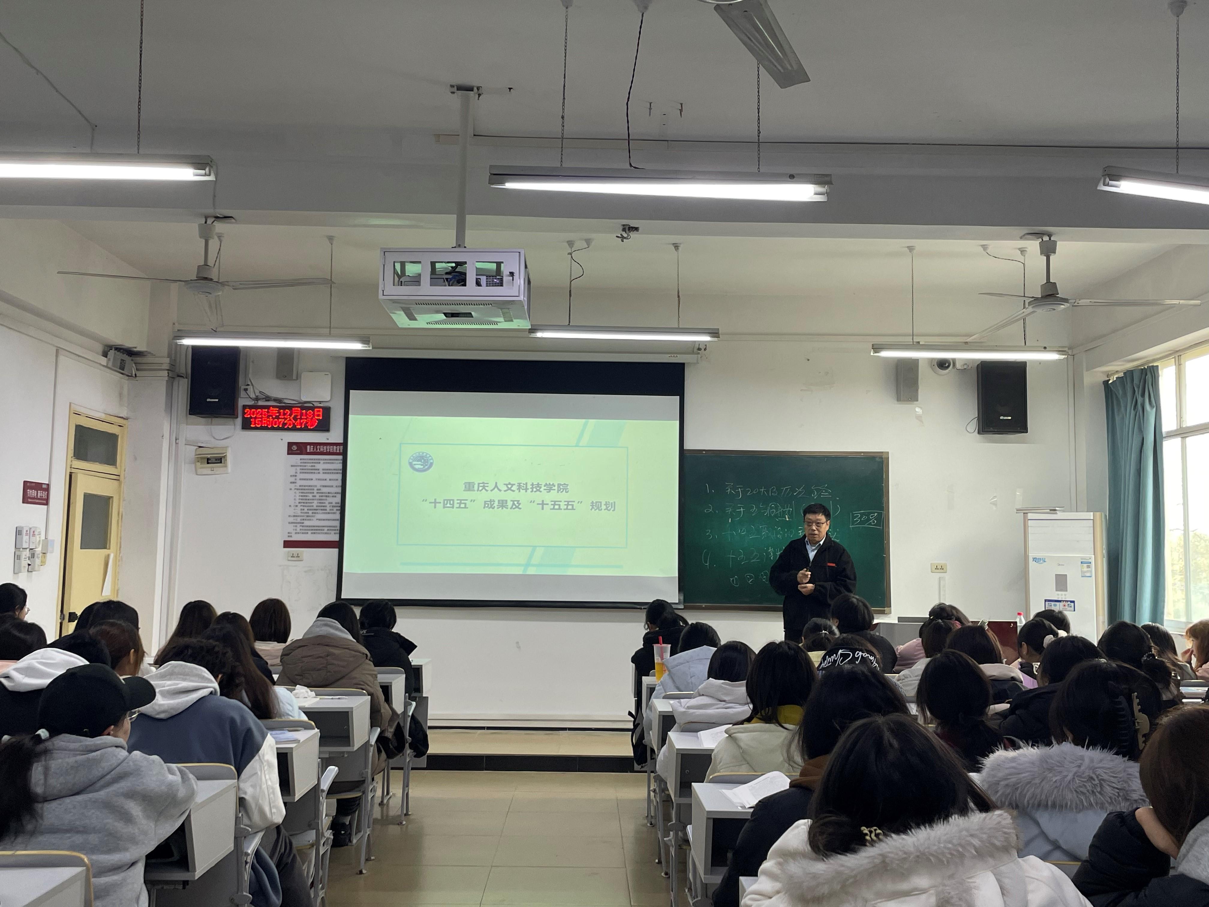 除了从国家战略层面解读了“十五五”规划方向与重点任务,也紧密结合学校发展实际,盘点了学校“十四五”期间取得的成果,包括成功通过教育部本科教育教学工作合格评估、7个师范专业顺利通过二级认证等,让同学们真切感知学校发展与国家战略的同频共振。同时,他展望“十五五”发展蓝图,介绍了学校即将推进的教育教学审核评估工作及办学层次提升规划,明确表示学校将为学生成长成才搭建更广阔的平台,为同学们未来发展注入信心与动力。
