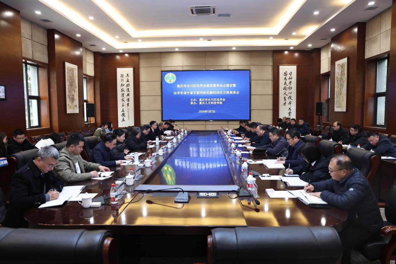 1月7日,合川区法学会基层服务站点建设暨法学专家矛盾纠纷化解法治化座谈会在学校顺利召开。重庆市法学会党组成员、专职副会长兼秘书长何国峰,合川区委常委、政法委书记、区法学会会长秦辉富出席会议并讲话。学校党委书记、政府督导专员彭体春致辞,西南政法大学法学院副教授胡江、荣德心理与事业发展咨询所所长周矩等专家,以及合川区相关部门负责同志、律所代表、学校校长助理王璐、法学系教师代表参会。会议由重庆市合川区法学会党组成员、副会长田静主持。