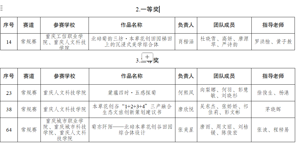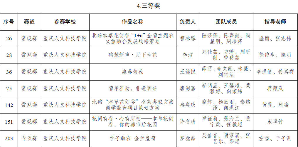 近日,重庆市教育委员会发布了《关于第五届重庆市大学生乡村振兴创意大赛获奖情况的通报》,学校在本届大赛中再创佳绩,学生参赛作品共斩获一等奖1项、二等奖3项、三等奖7项。本届大赛共吸引全市139所高校的4560个项目参与角逐,经专家评审、结果公示等严格环节,学校参赛团队发挥稳定、表现亮眼,最终在激烈竞争中取得多项奖项。
