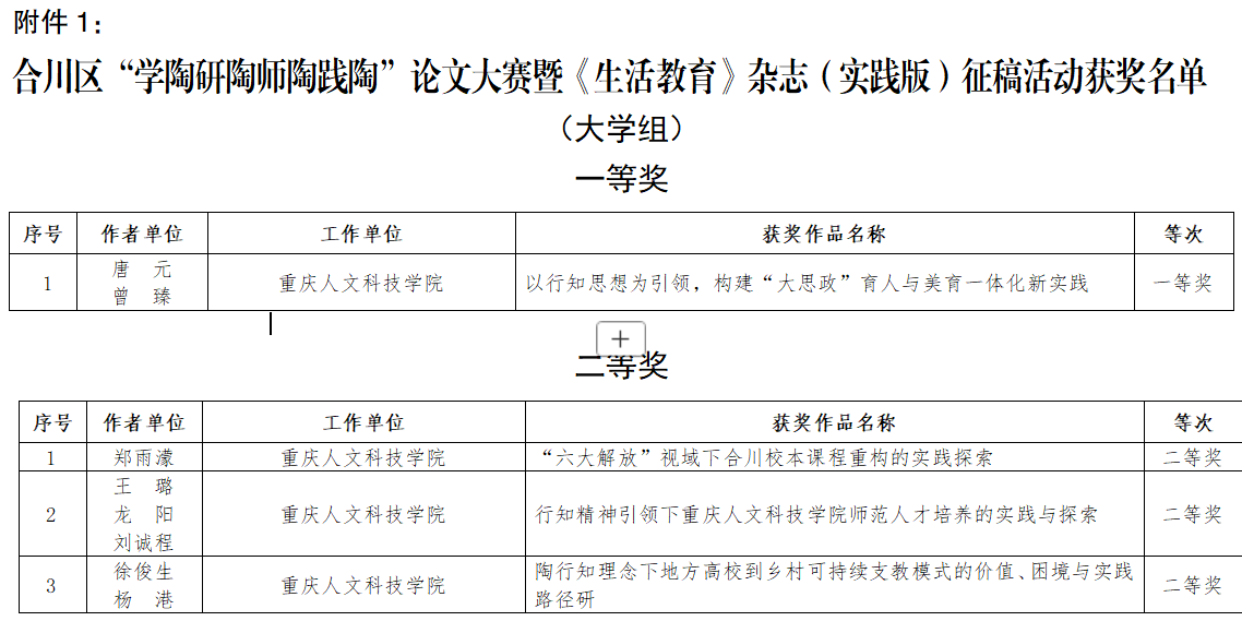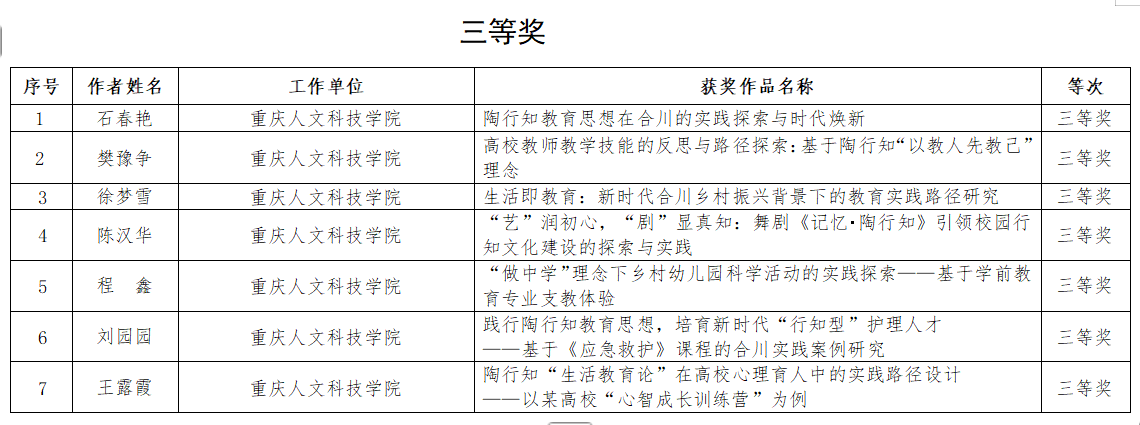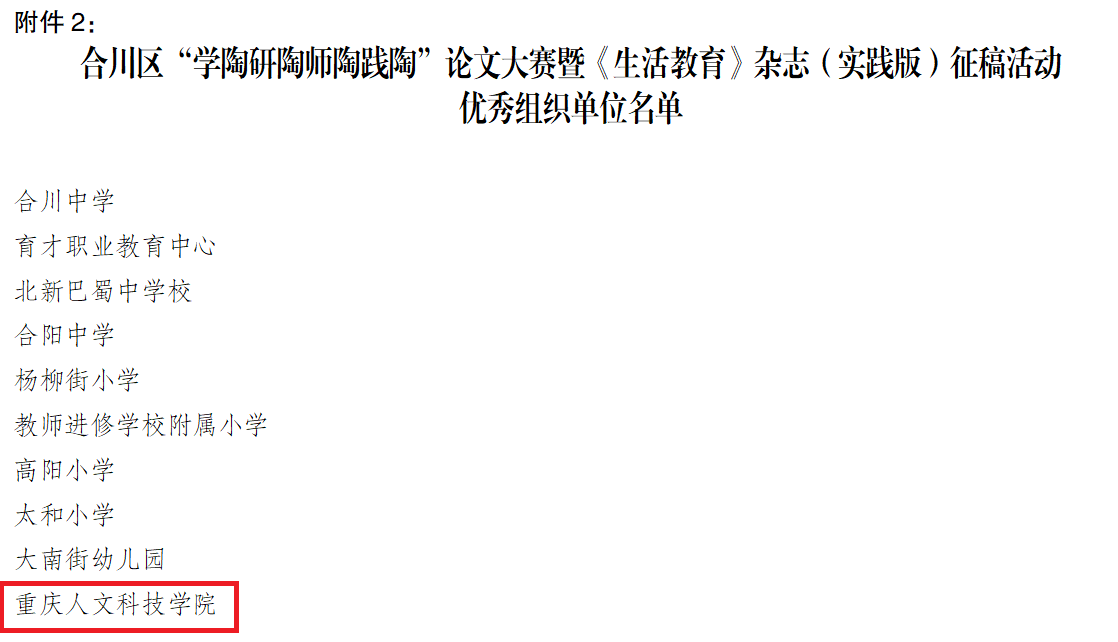 近日,重庆市合川区教育委员会公布了全区“学陶研陶师陶践陶”论文大赛暨《生活教育》杂志(实践版)征稿活动评选结果。我校教师在此次活动中表现突出,共荣获大学组一等奖1项、二等奖3项、三等奖7项,获奖率达到100%。同时,学校被评为“优秀组织单位”,是全区唯一获此荣誉的高等院校。