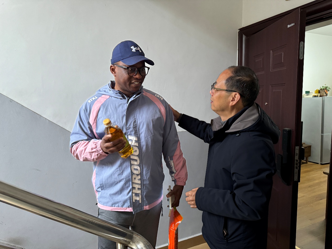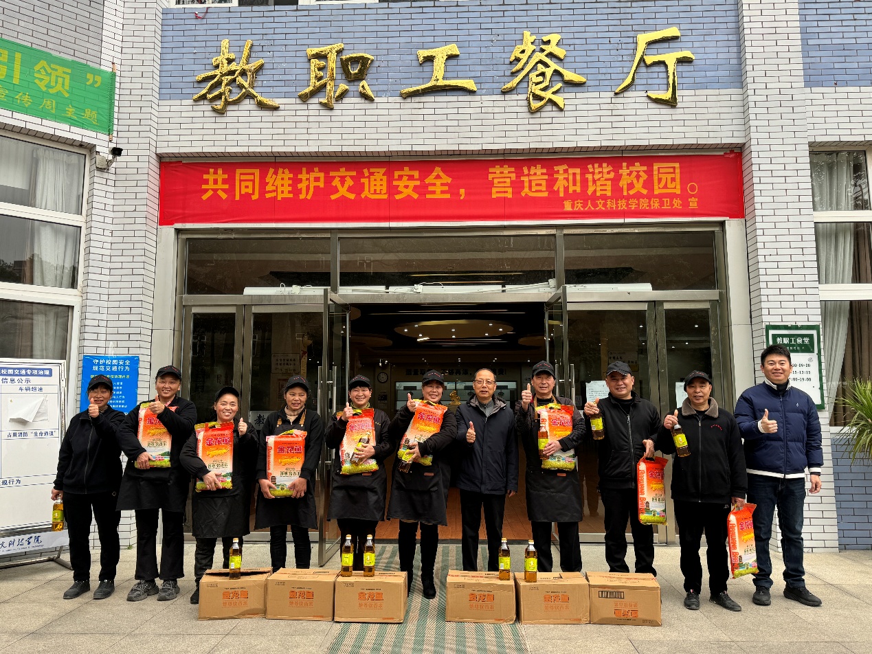周光明先后来到教职工食堂、校医务室、基建后勤处、资产处、保卫处、学生寝室楼、校车队休息室、消防指挥室、外籍教师公寓楼等地,慰问了春节期间值班值守人员并致以节日的问候和新春的祝福。每到一处,周光明都与大家亲切交谈,详细了解假期值班值守、安全保障等方面的情况,询问关心大家的身体和生活情况,并代表学校向他们送上慰问品,感谢大家在春节假期间的无私坚守和辛勤付出,勉励大家继续守好岗、尽好责,进一步加强重点场所、重点部位的安全检查,及时消除各类安全隐患,为校园的安全稳定和各项工作有序运转提供保证,为学校度过一个安全祥和的春节保驾护航。