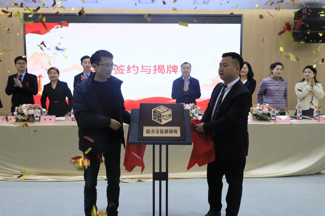 在与会嘉宾的共同见证下, 马克思主义学院常务副书记兼副院长韩亮与徐斌代表双方签署《共建“法立方法律诊所”合作协议》,并为“法立方法律诊所”揭牌。这标志着我校首个由马克思主义学院联合专业律所共建、深度融入“一站式”学生社区的公益法律服务阵地正式投入运营。