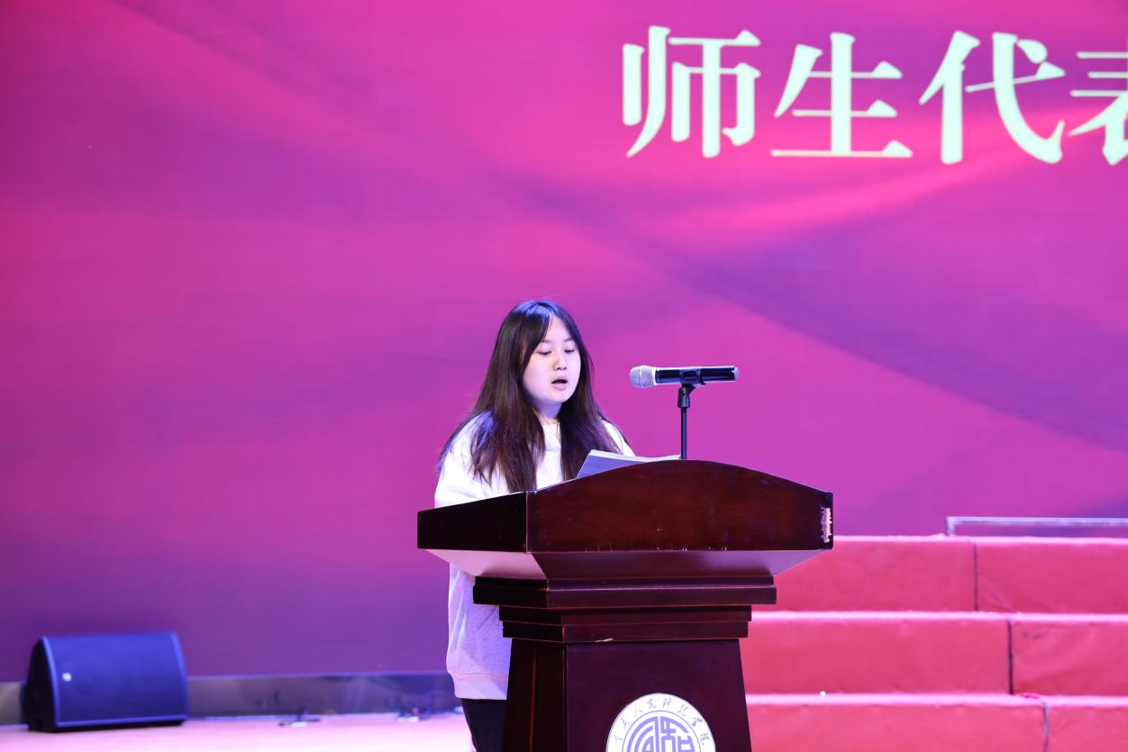 学院代表、教育与艺术学院曾格男,机关代表、学生处副处长李巍,学生代表、校团委大学生艺术团高佳同学依次上台,从不同视角分享校歌感悟。他们纷纷表示,校歌歌词真挚深入人心,旋律昂扬朗朗上口,精准勾勒了学校地理风貌,完美融合学校人文底蕴与行知精神,是学校独有的精神象征。