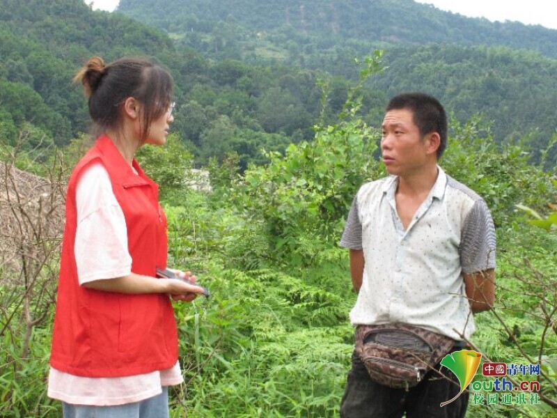 图为实践团成员在询问村民关于蓝莓园的具体情况。中国青年网通讯员 刘奕欣 摄