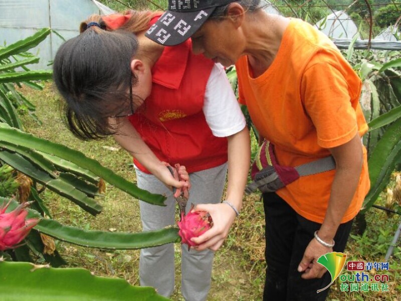 图为实践团成员在村民的指导下采摘火龙果。中国青年网通讯员 刘奕欣 摄