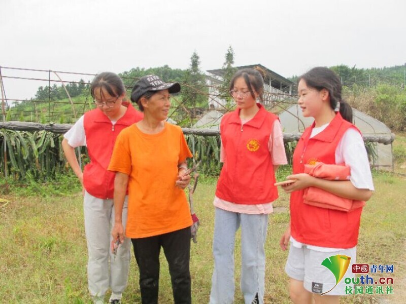 图为实践团成员向村民询问有关火龙果园的具体情况。中国青年网通讯员 刘奕欣 摄
