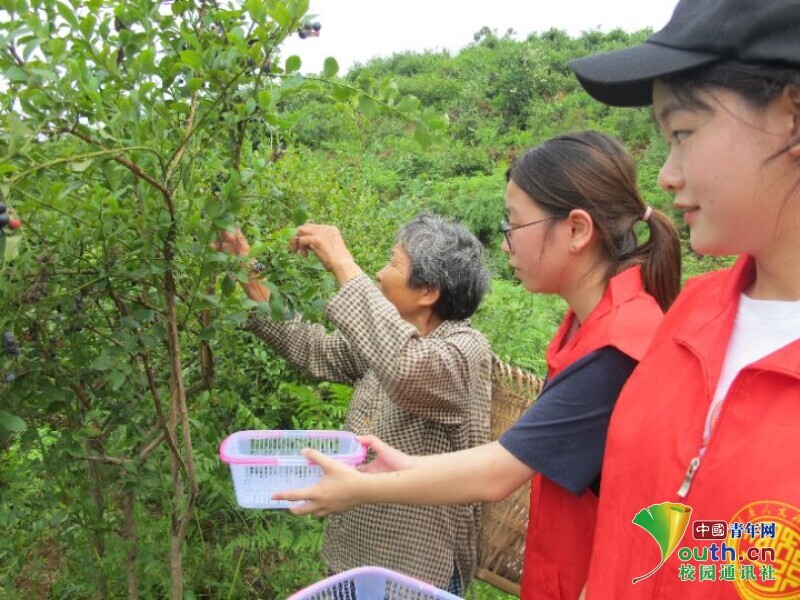 图为实践团成员在村民的带领下采摘蓝莓。中国青年网通讯员 刘奕欣 摄