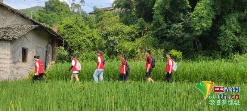图为实践队队员在村民的带领下走在拜访的路上。中国青年网通讯员 张柒 摄