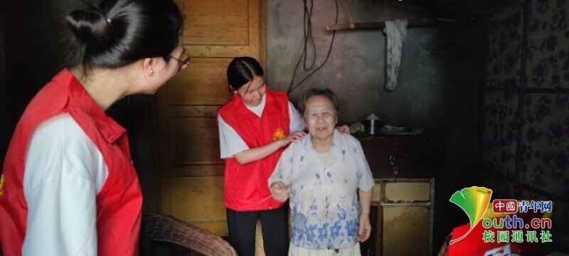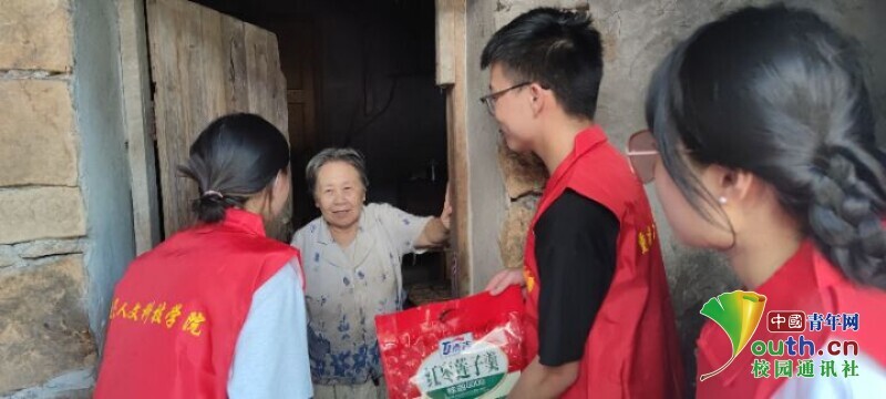 图为实践队队员为左绍结奶奶送上慰问礼品。中国青年网通讯员 张柒 摄