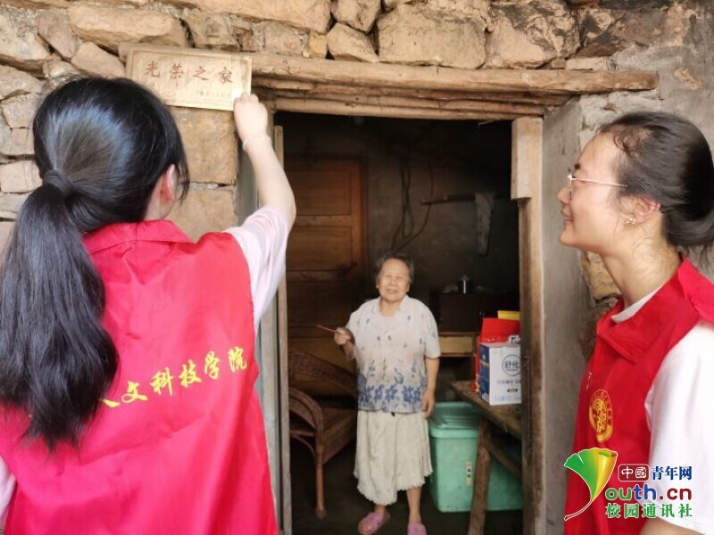 图为实践队队员为左绍结奶奶家门前的“光荣之家”做清理。中国青年网通讯员 成天漫 摄
