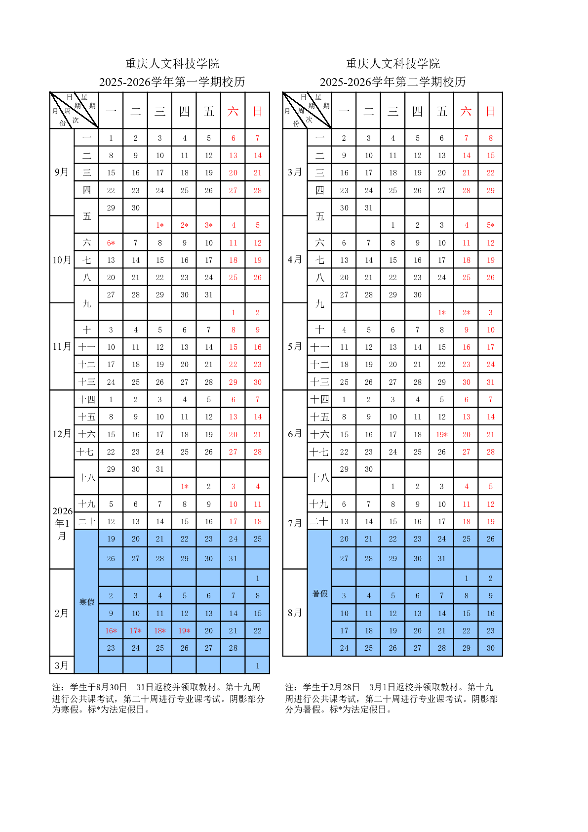 重庆人文科技学院2025-2026学年校历