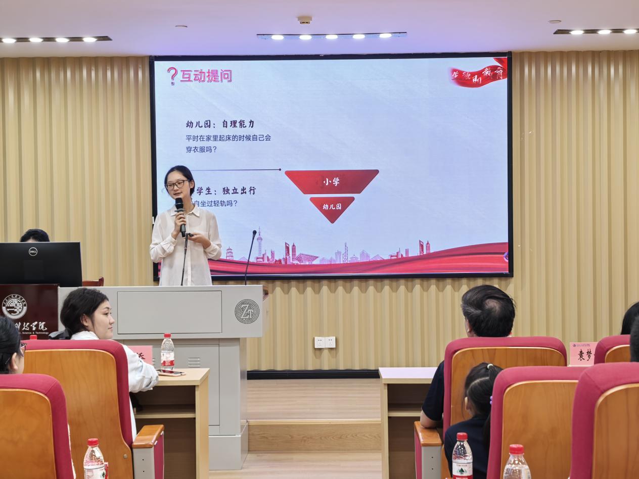 课堂打破学段壁垒,由三位教师接力完成。田菁园老师以“生活是教育的源泉”为题开启小幼板块,“同学们会自己穿衣服吗?”“蛙泳是模仿哪种动物?”一连串贴近童真的提问瞬间点燃气氛,孩子们争相举手,在欢声笑语中体悟“生活处处有课堂”。