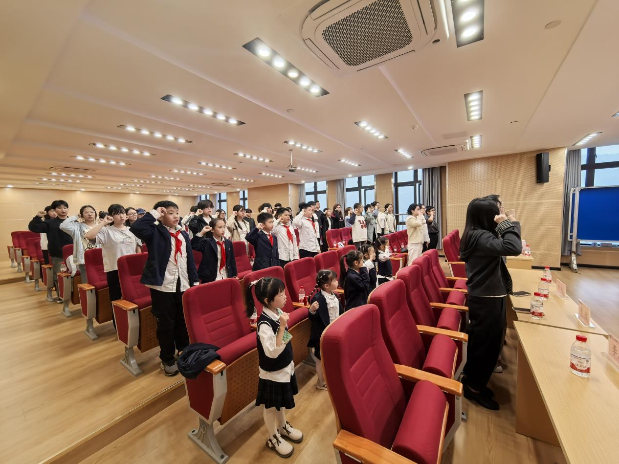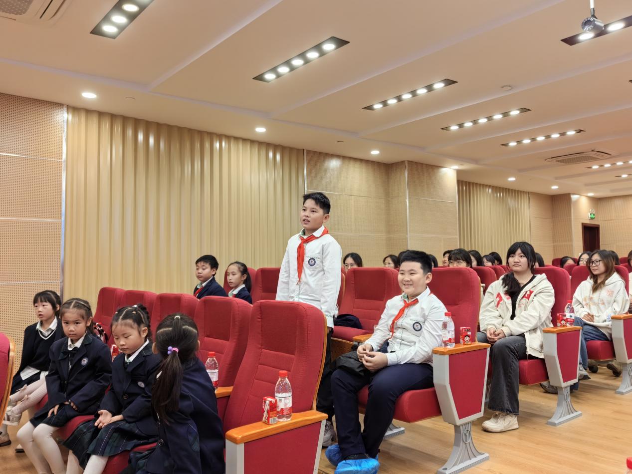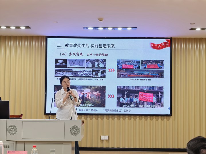 大学板块由杨舒闳老师担纲。她以“传承与创新——做新时代的行动者”为主题,邀请大学生分享“三下乡”调研、社区抗疫、乡村振兴等实践经历,并抛出“陶行知精神如何在强国建设中焕发新光芒”的思考,鼓励学生以知促行、以行求知,把青春播撒在火热的实践中。课程尾声,全体学生起立宣誓:“我立志传承陶行知生活教育思想,以生活为课堂,以实践为路径……”铿锵誓言回荡教室。