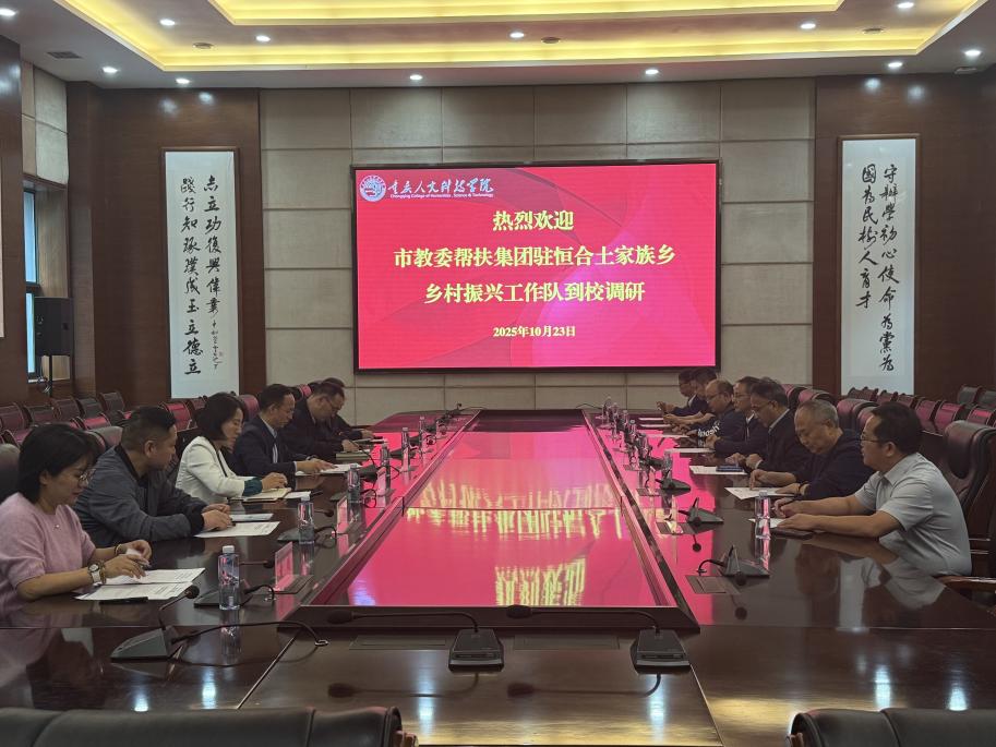 10 月 23 日 ,重庆市教委帮扶集团驻恒合土家族乡乡村振兴工作队到我校调研,双方就深化恒合土家族乡对口援建工作、推进校地协同振兴召开座谈会。会议由校长助理双海军主持,学校财务处、后勤处和乡村振兴学院相关负责人参会。