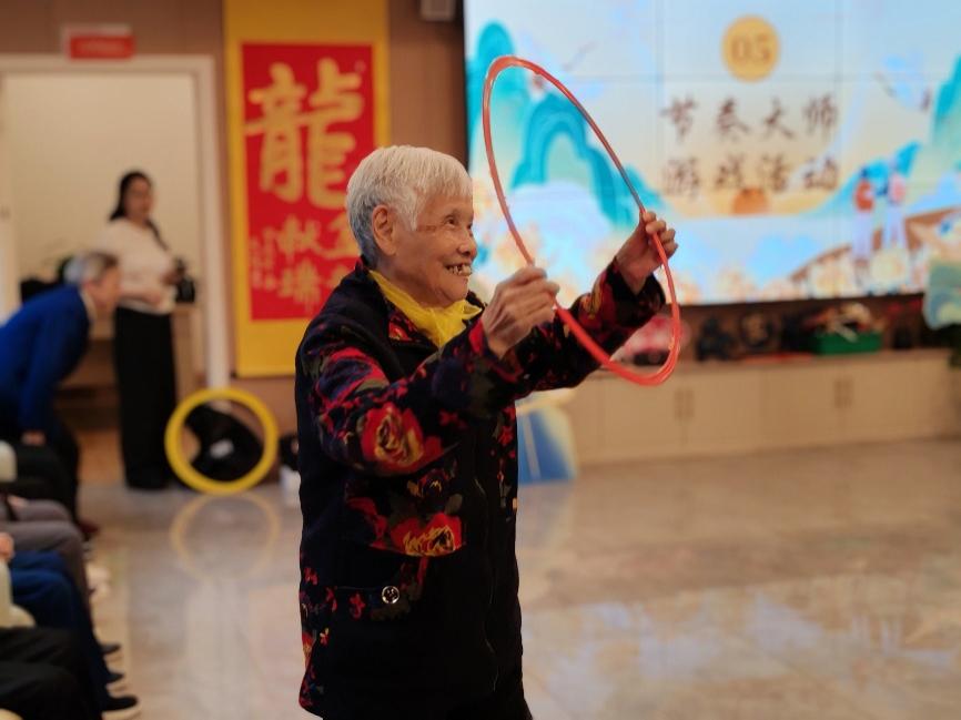 生日派对的甜蜜尚未消散,“节奏大师”游戏活动便接踵而至。《晨曲》的轻快旋律中,师生们带着长者们用简单的肢体动作“送太阳”,开启活力满满的互动时光;随后的乐器体验环节,长者们亲手敲打各类乐器,在清脆声响中感受音乐的魅力;而《灯塔》纸杯游戏更是考验协作与节奏,长者与师生分组配合,用纸杯和一次性筷子跟着音乐节奏互动,在彼此的默契配合中,不仅收获了游戏的快乐,更感受到了陪伴的温暖。