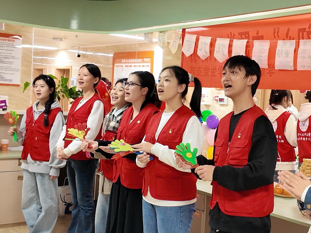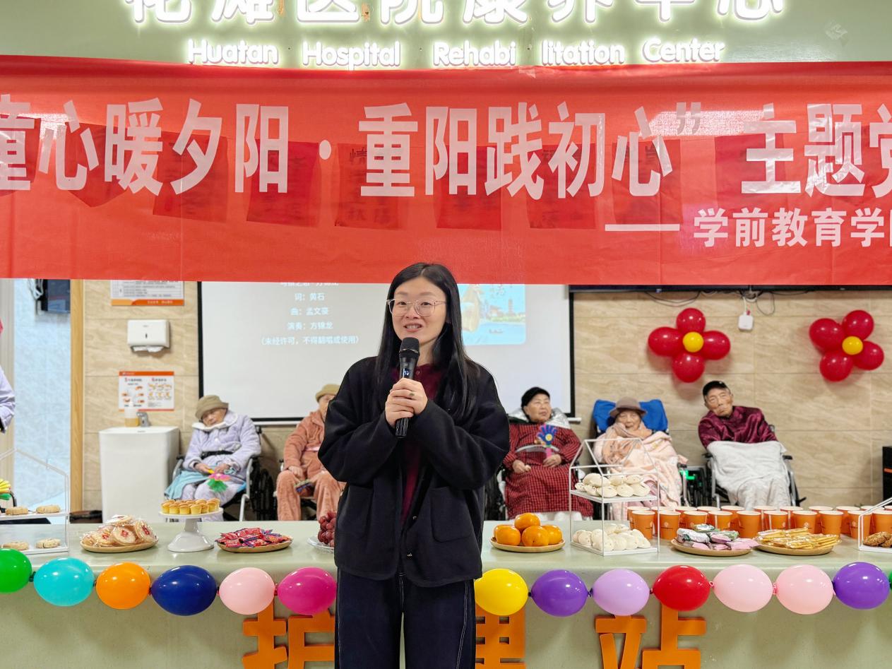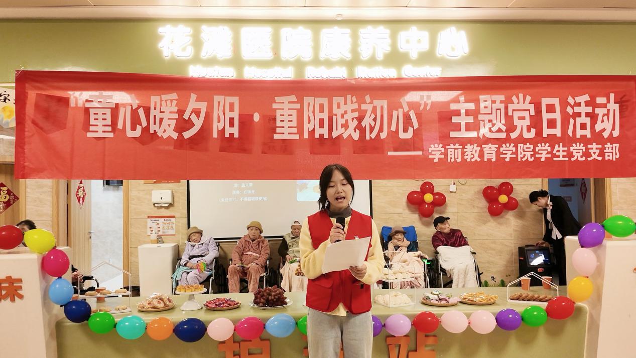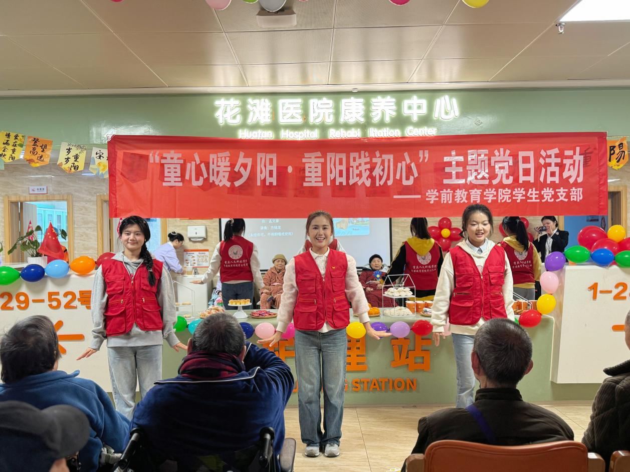 金秋送爽,丹桂飘香,又是一年重阳至。为弘扬中华民族尊老、敬老、爱老的传统美德,践行“老有所养、老有所乐”的服务理念,充分发挥基层党组织战斗堡垒与党员先锋模范作用,10月29日,学校学前教育学院党总支书记宋伟、马克思主义学院(政治与法律学院)副院长唐欣、习近平新时代中国特色社会主义思想概论系主任杨莎、学前教育学院学生党支部书记陈薇一行带领学生党支部部分学生党员和入党积极分子们来到了合川花滩医院康养中心,以“行走的思政课堂”形式,开展“童心暖夕阳·重阳践初心”敬老爱老主题党日活动,与康养中心老人们一起共度一个温馨而难忘的重阳节。