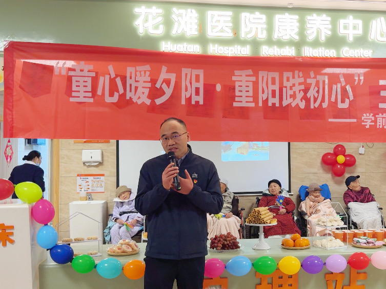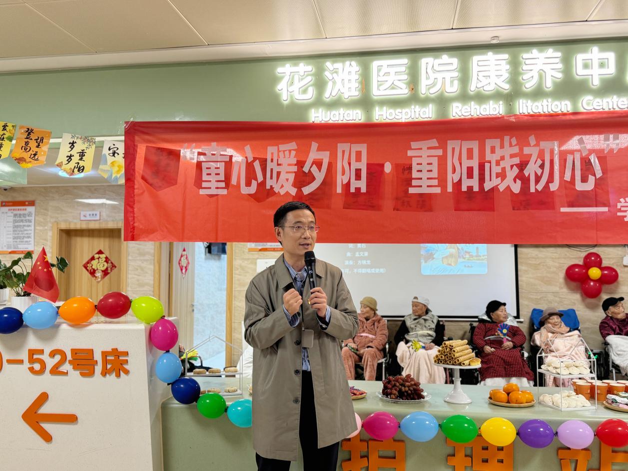 接着,花滩医院康养中心负责人曾伟对大家的到来表示热烈欢迎。他结合学生成长与发展提出期许,希望未来能有更多这样的机会,并表示康养中心愿意为同学们搭建学习实践的平台,让大家在与老人的互动中积累服务经验、提升专业能力,为今后的就业发展打下坚实基础。