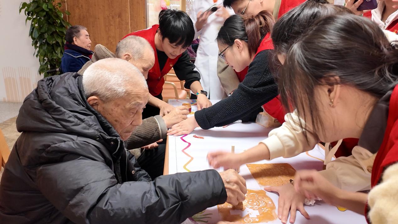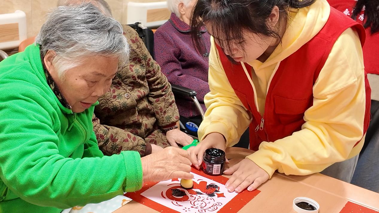 在“拓映福字”活动环节,“小先生”们提前备好红色宣纸与拓印工具,手把手教老人拓按,老人们专注地跟着模仿操作,有的还特意在福字旁画上小菊花点缀,这小小的福字,成了最特别的重阳礼物。