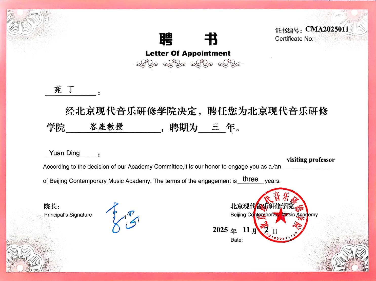 活动现场,指南针乐队在红馆音乐厅登台献艺,凭借精湛表演赢得阵阵掌声。苑丁受聘为北京现代音乐研修学院客座教授,为两校在音乐教育领域的深度合作奠定了坚实基础。