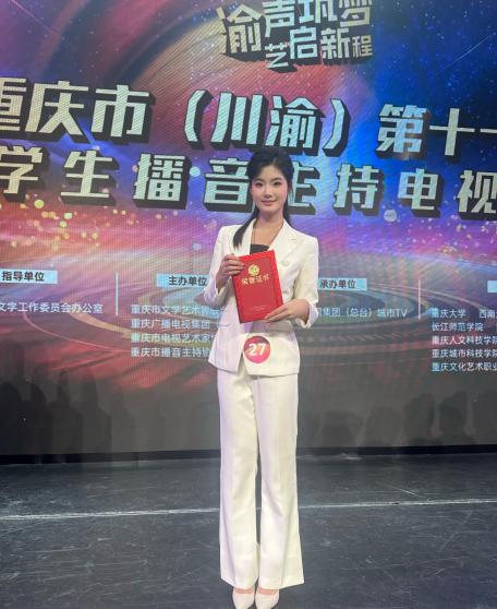 近日,由重庆市教育委员会、四川省教育厅联合主办,重庆广播电视集团(总台)承办的第十一届重庆市(川渝)大学生播音主持电视大赛圆满收官。我校播音与主持艺术专业学子表现优异,2023级3班罗成获二等奖,2024级3班黄文娴获三等奖。