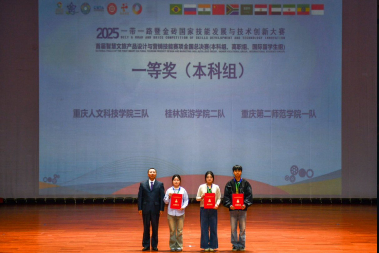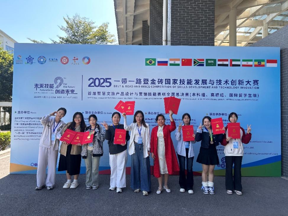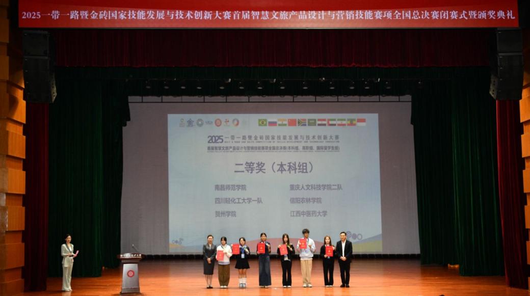 11月11日至13日,2025“一带一路”暨金砖国家技能发展与技术创新大赛首届智慧文旅产品设计与营销技能全国总决赛在广西南宁职业技术大学圆满落幕。管理学院两支参赛队伍在激烈角逐中脱颖而出,在智慧文旅产品设计与营销技能赛项中荣获本科组一等奖、二等奖,学校获得“最佳组织奖”和“优秀组织奖”荣誉称号。