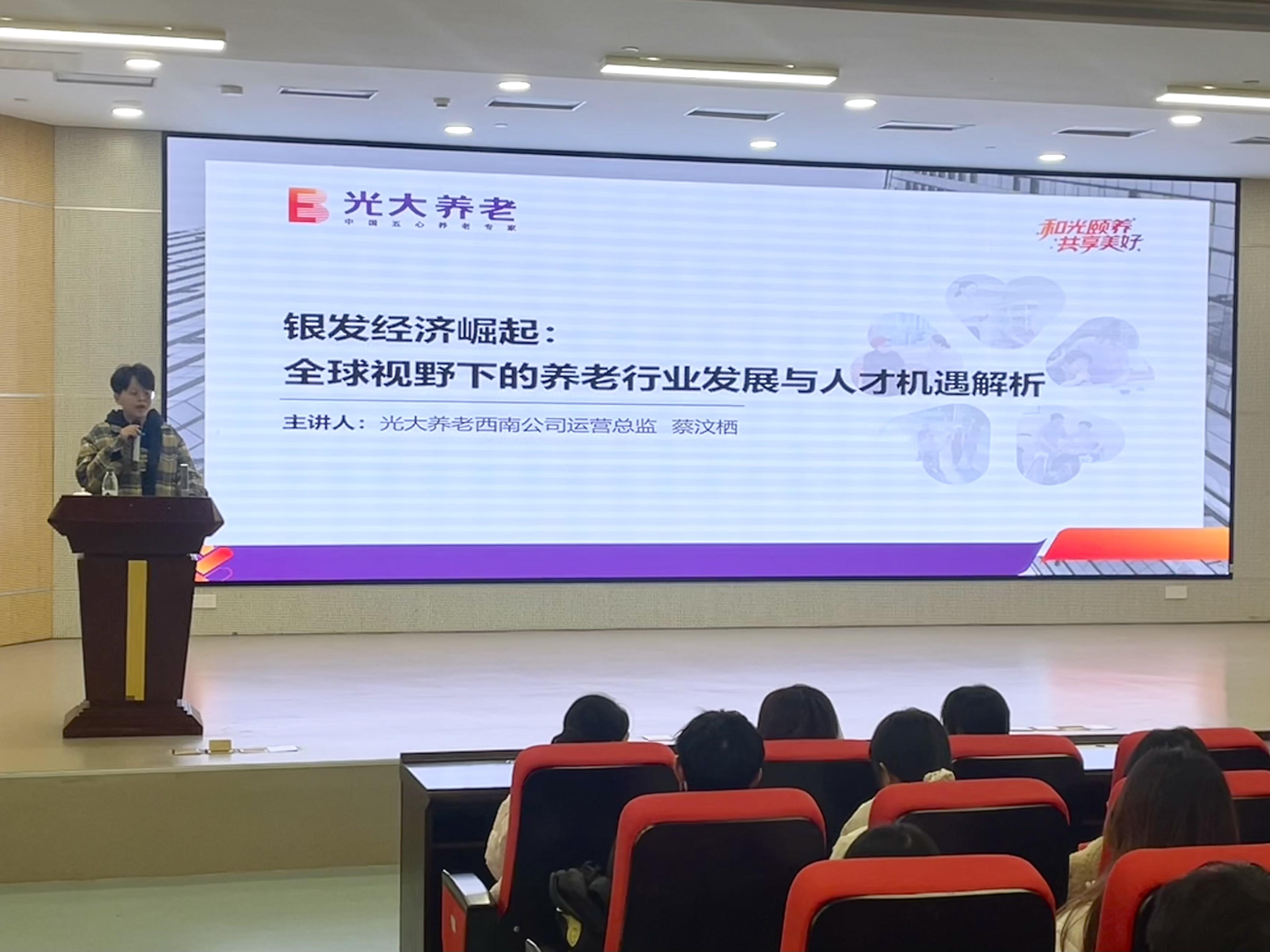 本次讲座特邀中国光大养老西南公司运营总监蔡汶栖主讲。蔡汶栖深耕养老行业十余年,具备百余家养老机构全流程运营管理经验。她立足全球老龄化背景,系统剖析了国内外养老服务体系的现状、挑战与升级路径,并结合重庆地区产业特点,指明了护理专业人才的能力进阶方向。通过分享光大养老的实战案例,她清晰地勾勒出从一线护理服务到综合产业运营的多元化职业发展通道。