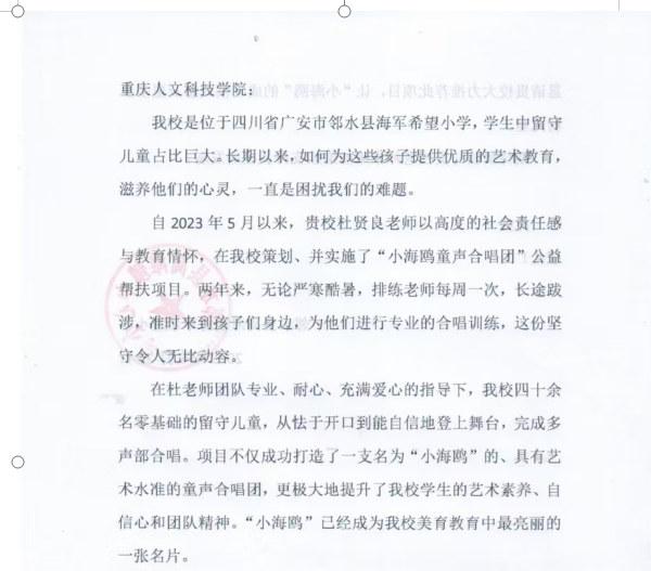 近日,我校收到一封来自四川省广安市邻水县高滩镇海军希望小学的信,我校艺术学院杜贤良老师以爱为笔、以乐为墨,绘就了一幅乡村美育的动人画卷。他策划组织的 “小海鸥” 童声合唱团,如同一束温暖的光,照亮了农民工子女的艺术成长之路。
