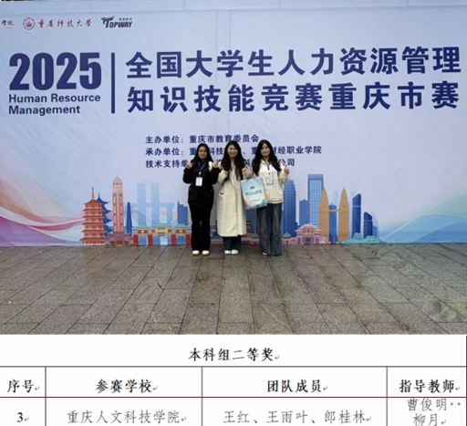近日,2025年全国大学生人力资源管理知识技能竞赛重庆市赛落下帷幕,我校管理学院学生获得市级二等奖1项、三等奖1项。