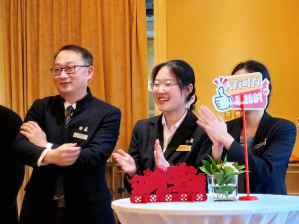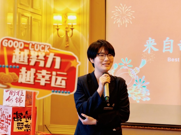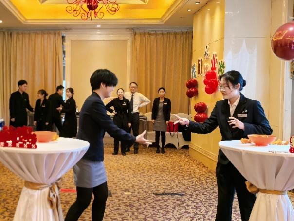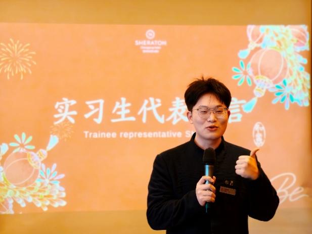 实习生代表姚春林同学以风趣幽默的语言,讲述了作为礼宾员的成长历程,从初入岗位时面对客人需求的手足无措,到熟练应对各类突发情况、精准提供服务的从容淡定,他用一个个鲜活的小故事,展现了从校园学子到职场新人的蜕变,赢得全场阵阵掌声。肖玲珑同学聚焦宾客服务中心的工作日常,讲述了与同事之间相互扶持、互帮互学的温暖瞬间,正是这份团结协作的氛围,让自己快速适应岗位,深刻体会到服务行业的责任与温度。