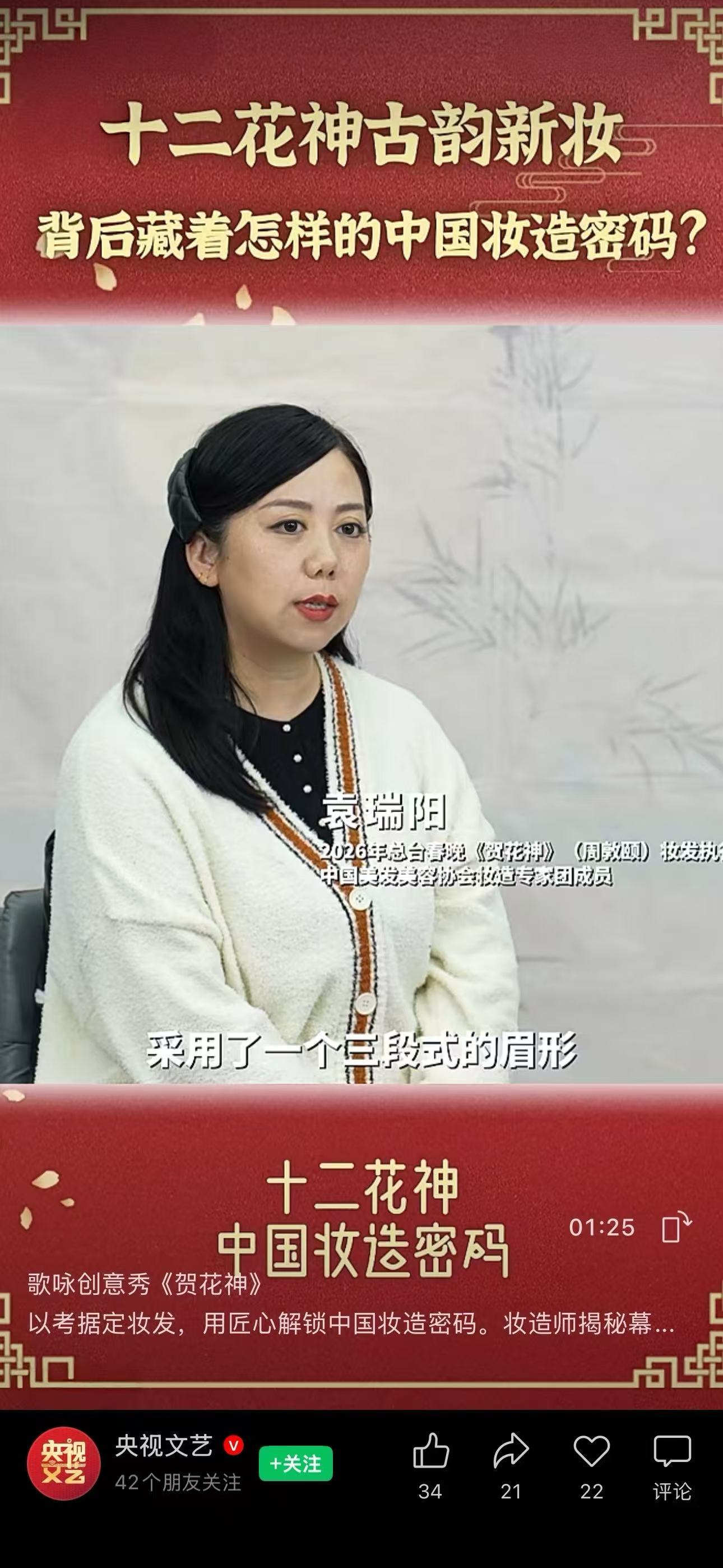 近日,袁瑞阳老师因在《贺花神》节目中的突出贡献,受邀接受中央广播电视总台“央视文艺”频道专访,讲述节目妆造设计背后的创作故事。