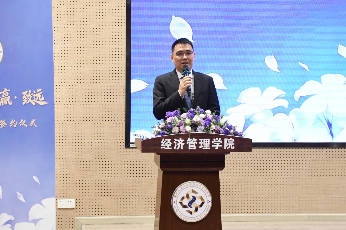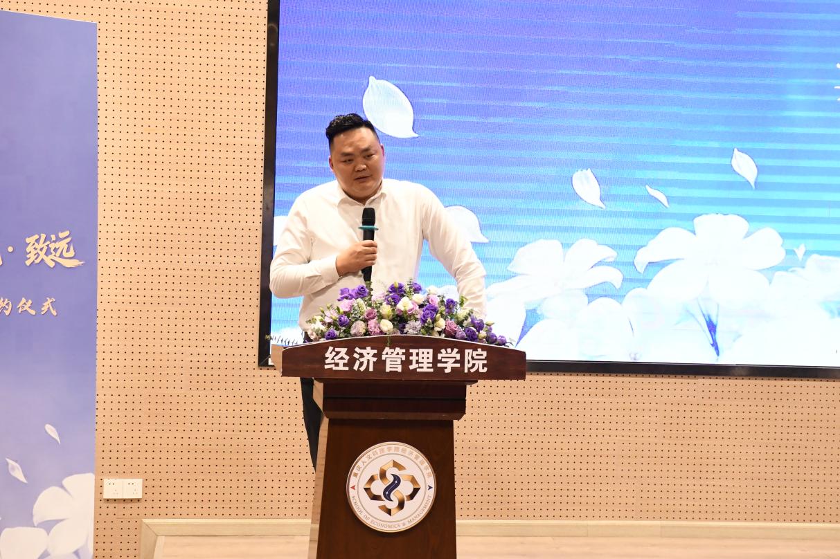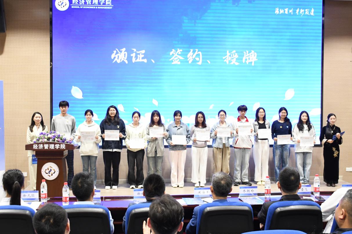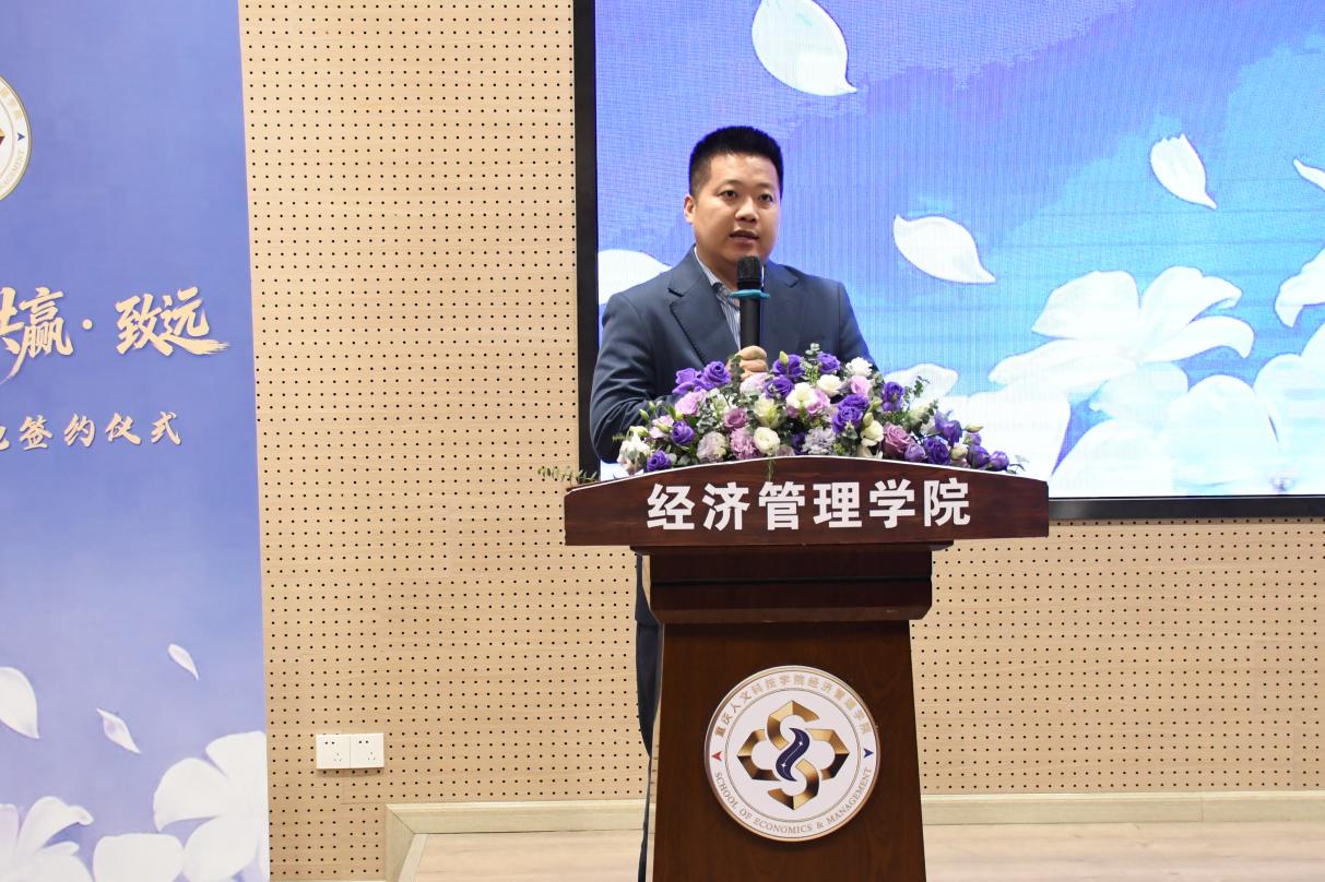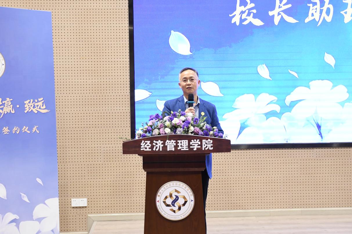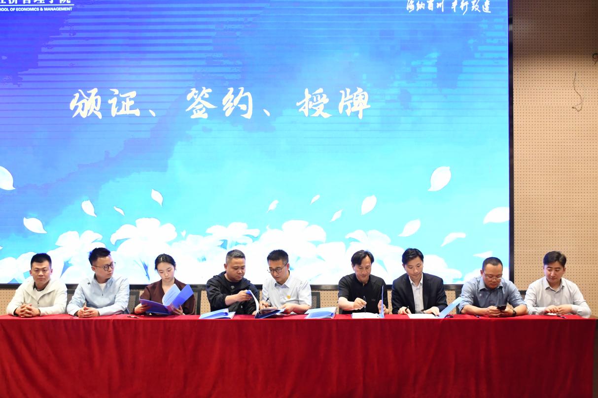 为深化产教融合、推进校企协同育人,精准搭建人才培养与产业需求对接平台,4月8日,学校经济管理学院“同心·深耕·共赢·致远”产教融合基地签约仪式在海丰楼112报告厅隆重举行。行业商会、企业代表、学校领导及师生代表齐聚一堂,共同见证校企合作重要时刻。签约仪式由学院党总支书记黄代蓥主持。