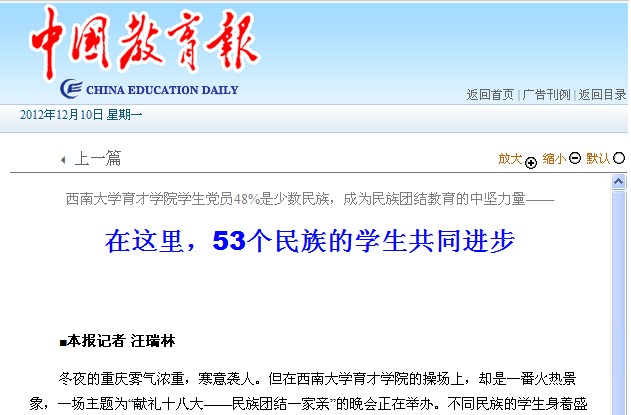 冬夜的重庆雾气浓重,寒意袭人。但在西南大学育才学院的操场上,却是一番火热景象,一场主题为“献礼十八大——民族团结一家亲”的晚会正在举办。不同民族的学生身着盛装,《康定情歌》、《大地飞歌》等民族歌舞节目轮番上演,赢得现场雷鸣般的掌声。