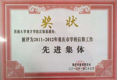 2013年1月23日,重庆教育委员会在重庆大学召开了全市学校后勤系统团拜会暨表彰大会。学院后勤基建处被评为“2011-2012年度重庆市学校后勤工作先进集体”,陈华和邹心泉两位同志获得“2012年度重庆市学校后勤工作先进个人”荣誉称号。