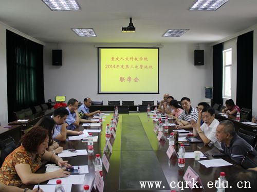 9月11日,重庆人文科技学院召开了2014年度第三次警地校联席会。合川区政法委、国安办、合川区教委、草街街道党工委、政法委、综治办、建设办、市政执法队、派出所、大庙村等相关领导,重庆人文科技学院副校长周宏光、李渤川,党委副书记舒卫华,学生工作与就业处、后勤基建处、保卫处相关负责人员参加了大会。