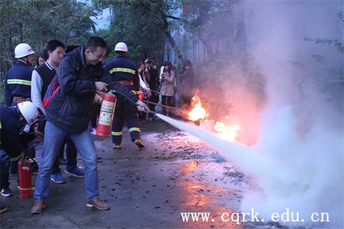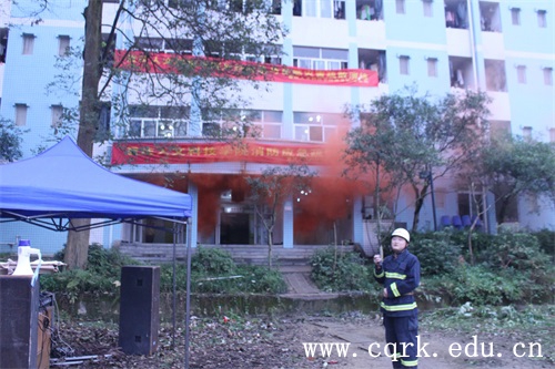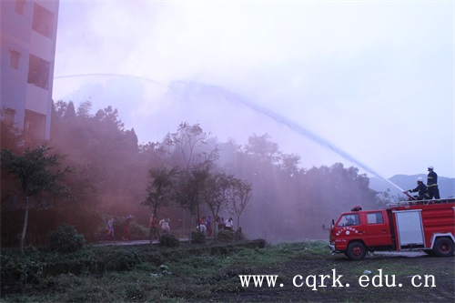 11月13日下午,为贯彻落实《消防法》及《高等学校消防安全管理规定》,积极宣传2014年119消防日主题“消防走进校园,安全护航青春”,由重庆人文科技学院主办,学生处与保卫处共同承办的大型消防实战演习在学校智园5舍楼前正式举行。