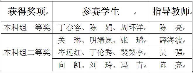 近日,记者从市教委获悉,我校在“2014高教社杯全国大学生数学建模竞赛”中取得佳绩,荣获重庆赛区本科组一等奖、二等奖,陈亮荣获“优秀指导教师”称号。据了解,我校学子已连续多年在此类竞赛中获奖。