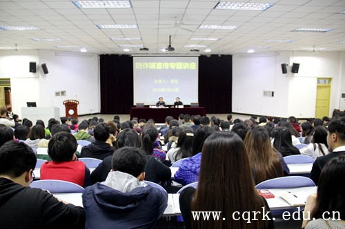 为切实做好学校安全防范教育,不断提高在校师生的防骗识骗的意识和能力,预防和减少诈骗案件的发生,3月24日下午,我校在图书馆报告厅举行了防诈骗宣传专题讲座。本次讲座由副校长周宏光主持,草街街道派出所所长冯云主讲。