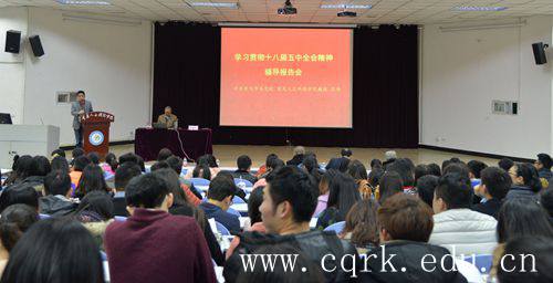 为深入学习宣传贯彻党的十八届五中全会精神,提高各级党政领导干部和思政工作者的理论水平和工作能力,推动学校党建工作的创新与发展,12月2日下午,我校在图书馆报告厅举行了党委中心(扩大)学习组报告会。校长何向东,校领导李渤川、陈金玉、舒卫华、税国洪、叶培德出席会议。全校副科级以上领导干部,各二级学院党总支书记、副书记、书记助理、总支委员,全体学生辅导员以及2015年新入党党员参加了报告会。此次报告会由中共重庆市委党校、重庆人文科技学院苏伟教授主讲,党委副书记舒卫华主持。