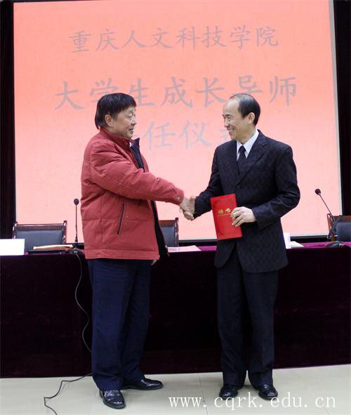 副校长陈金玉宣读了《重庆人文科技学院关于聘任马善祥同志为大学生成长导师的通知》;校长何向东为马善祥同志颁发了聘书。