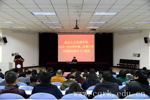 校长何向东首先通报了2016年寒假机关各部门所做的主要工作。寒假期间,机关各部门各司其职,有序推进各项工作:一是加强内涵建设,提升人才培养质量。有序推进了精品在线开放课程的建设工作,完成了“3+4”分段人才培养改革试点项目申报工作和《2016年重庆市普通高校“专升本”工作实施方案》修改与信息反馈;做好了申硕和护理学专业专升本相关工作。二是加强教育管理,促进学生就业。学校为寒假留校和提前返校的学生安排集中住宿;为重庆籍建卡贫困学生发放了生活补贴;为考取公务员和就业毕业生办理相关手续;编写了《大学生安全教育》教材。三是强化基础设施,做好后勤保障。学校在假期抓紧对校园环境和设施设备的建设改造,加强了校园信息建设,做好了资产采购维护和财务审计工作。四是加强值班巡逻,保证校园安稳。学校每天安排人员在重点区域进行值班,对假期的来信来访、接待安排、信息接收与上报、文件收发等工作进行了安排管理,加强了学校安全隐患排查,整治了校园内乱搭乱建行为。